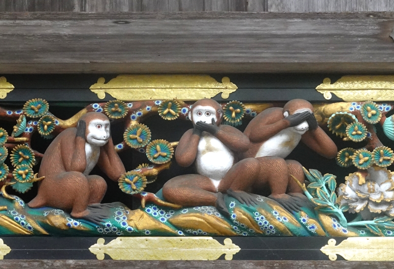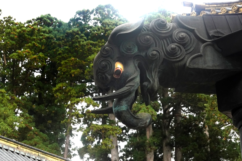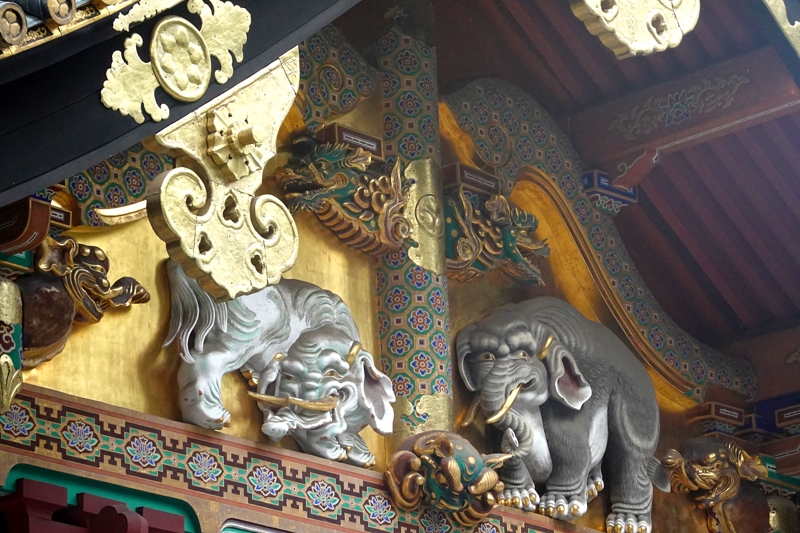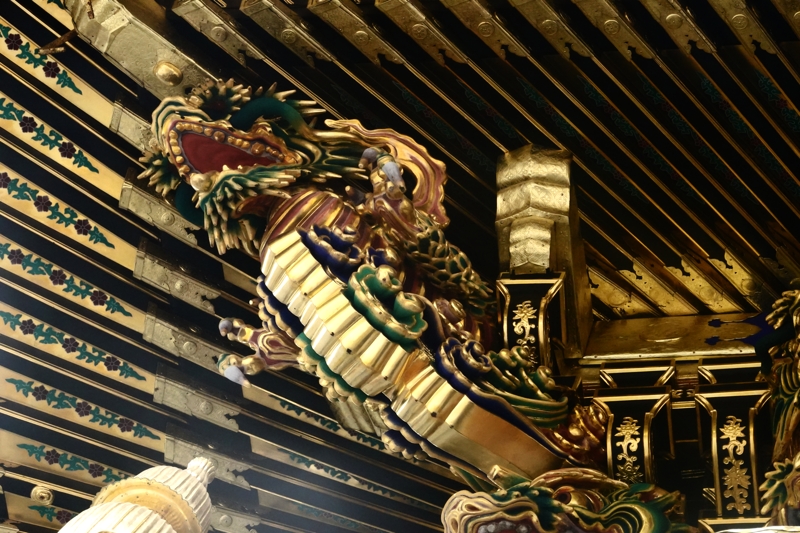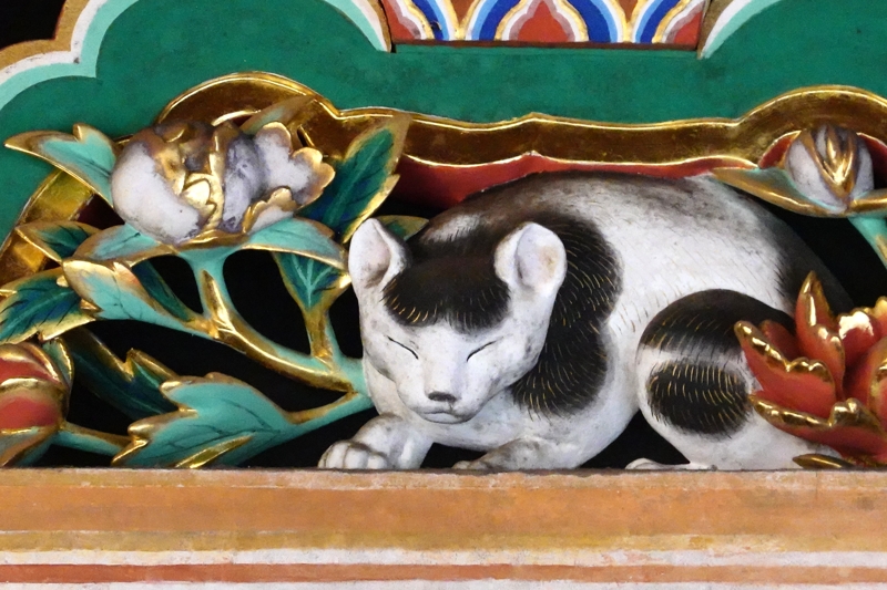 伝説的な彫刻職人左甚五郎の作品。特徴的なのは、眠っていること。この猫の裏に遊ぶ雀がほられていて、猫(戦国)が寝ている(平和)から、スズメ(国民)は、平和に暮らしていける、家康公に感謝!ということのようです。