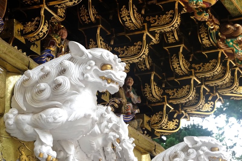 この唐門も見事です。陽明門もそうだけど、白がきれいです。日本の建築は、たいてい朱色に黒か金が多いんだけど、ここでは朱色はあまり使われず、白が際立って美しいです。これほど白が美しい建物は、ヨーロッパを含めて、どこにもないのではないでしょうか?