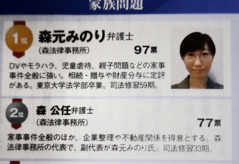弁護士ドットコムと東洋経済がタイアップした「弁護士が選ぶ弁護士ランキング」家族法部門で、弊所副代表森元がランキング1位になりました。2位は、代表の森です。