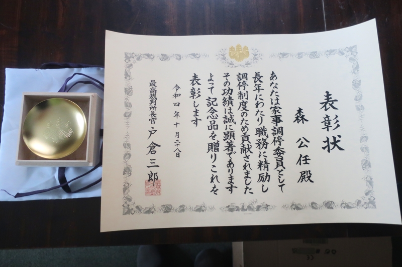 すでに東京高裁長官賞、東京家裁所長賞、日本調停協会連合会功労者表彰を受賞していますので、調停委員として、受賞すべき表彰は全て受賞し、20年にわたる調停委員の活動を終えることができました。