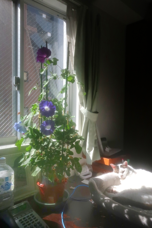 冷房完備の部屋で、朝顔を見ながらお日様をあびてまったり