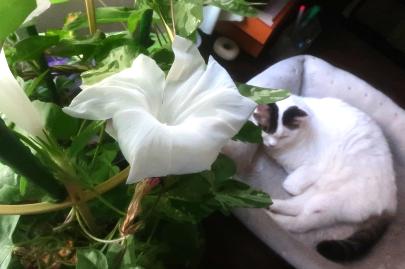 白い朝顔が咲きました。涼しげです。この朝顔も、夕方になるとピンク色になります。