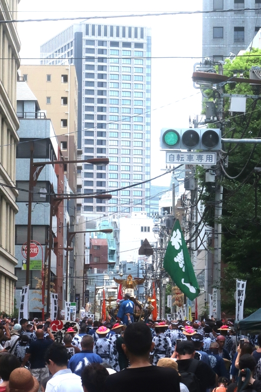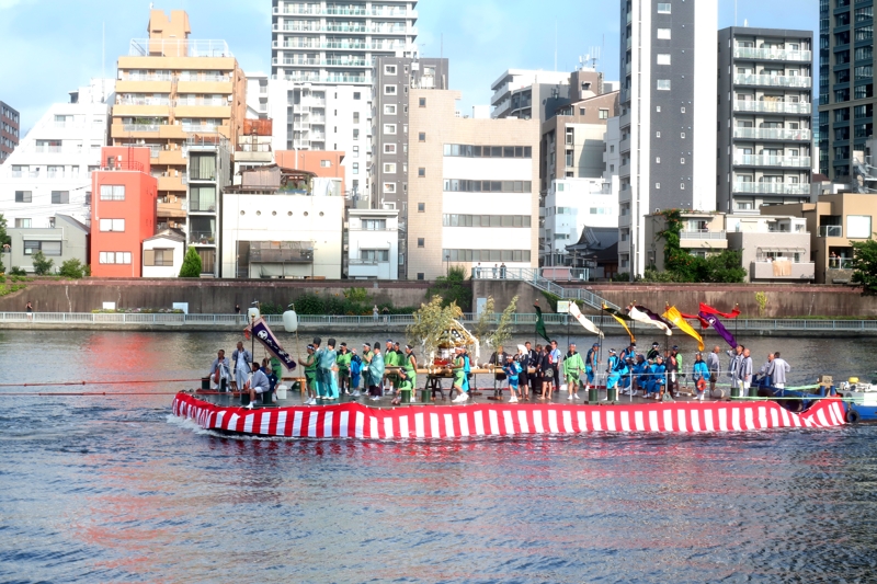 事務所の川向こうの佃島。住吉神社例祭(通称:佃祭)。祭りは佃地区、月島地区、勝どき地区に分かれて行われます。8月第一日曜日に行われた水上神輿。普通、神輿というのは、地ベタを神輿を担いでエイサ、エイサとやるものですが、ここは何と水上神輿です。中央大橋付近から海上まで行って戻ってきます。