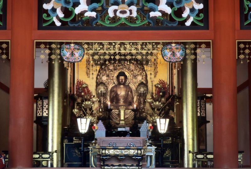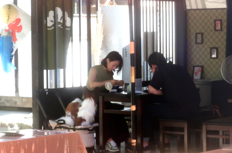 写真左、「毛越寺庭園」として特別名勝に指定されている庭園です。写真中央、毛越寺のご本尊「薬師如来」。写真右、毛越寺境内の食堂。二匹のワンちゃんが、物欲しげに飼い主を見ています。