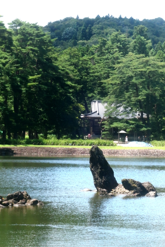 駅からまっすぐ毛越寺(もうつうじ)に向かいましたが、その手前にあるのが観自在王院跡。藤原基衡の妻が建設した寺院跡。 境内跡は「毛越寺境内 附 鎮守社跡」の一部として国の特別史跡、庭園は「旧観自在王院庭園」として国の名勝に指定されています。個人的には、この場所が、一番、よかったです。観光客がほとんどおらず、静かです。みな、ここを通りこして毛越寺にいってしまうからです。写真右、猛暑の中でも遺跡調査が行われています。