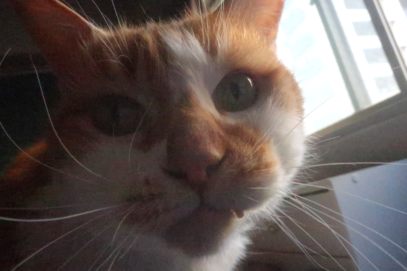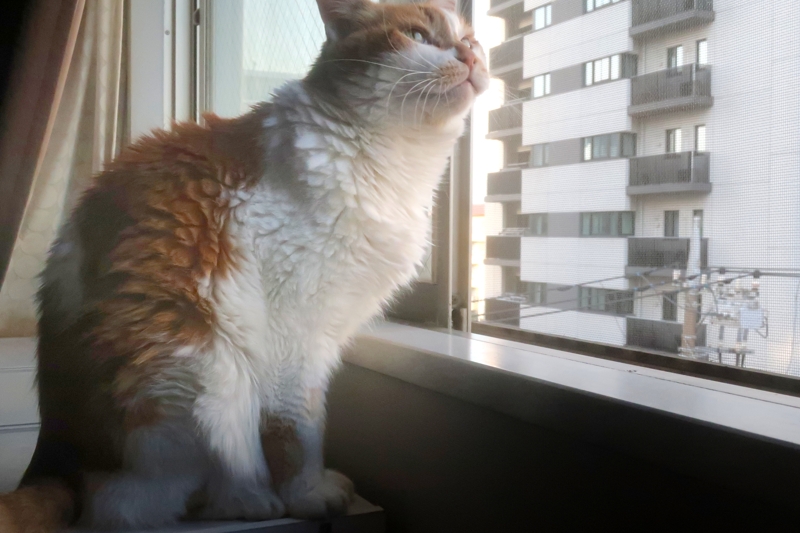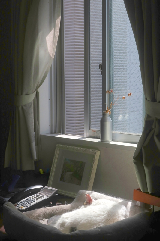 ハナちゃん、最近、この小会議室のテーブルの上で寝ています。日当たりがいいし、風通しもいいんで、お気に入りの場所のようです。