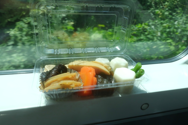 右の写真は、いつも、真鶴駅近くの総菜屋で勝っているお煮しめ。一つ一つに味がしみこんでいます。400円。