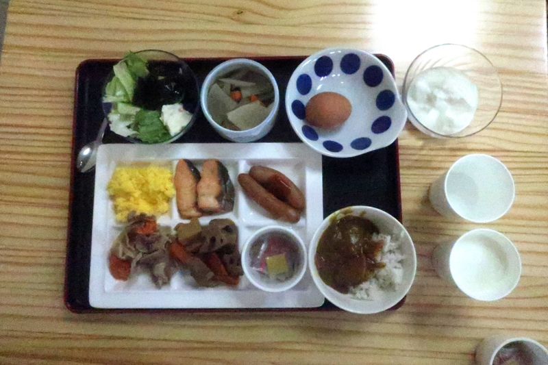 左下は、新幹線の中で食べたノリ弁。右下は、ホテルの朝食バイキング。このホテル、旅行客は、ほとんどおらず、現地で働く人たちが社宅代わりに使っているようでした。