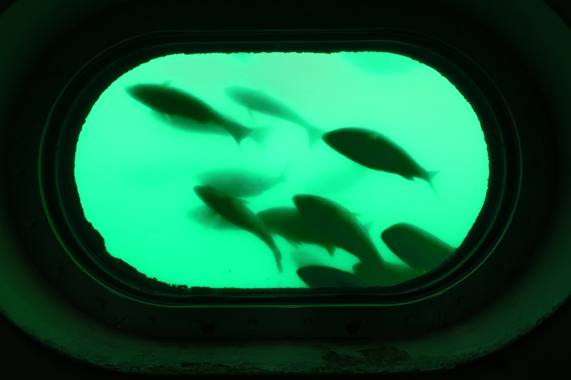 塔の階段を下りていくと小さな部屋があり、この部屋の窓から魚を眺めるのです。水族館と逆です。水族館は魚が箱の中にいてニンゲンは、その箱の中の魚を眺めますが、ここでは、ニンゲンは箱の中にいて魚がニンゲンを眺めます。