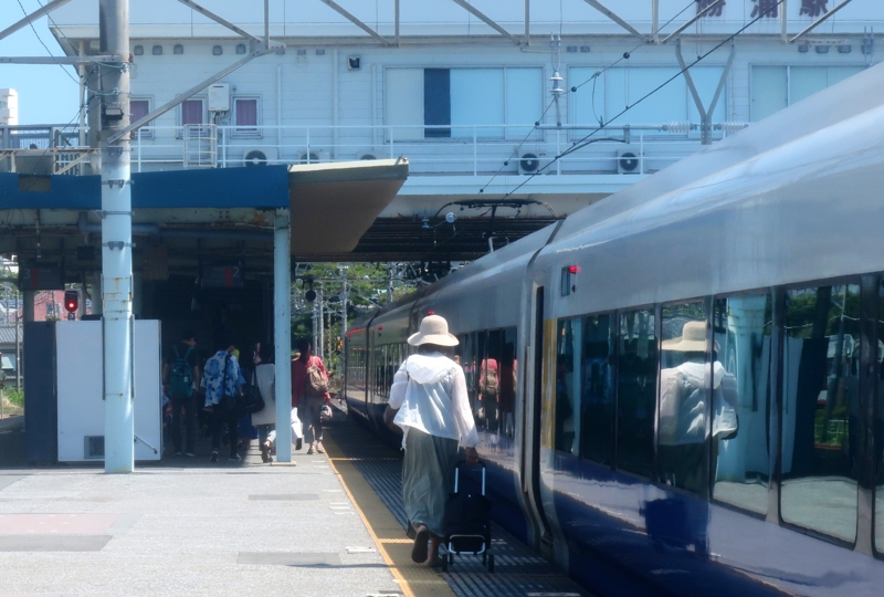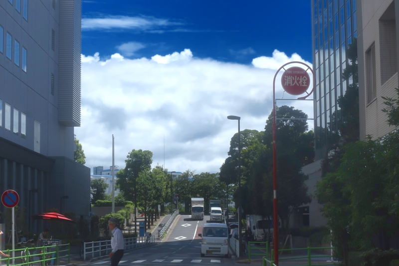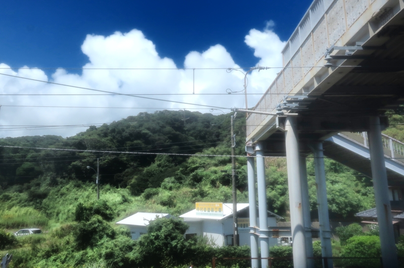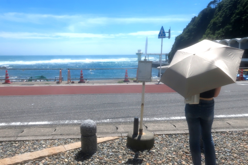 帰りは駅までバス。ここ勝浦は、気温が34度以上になったことは一度もないそうですが、それでも、猛暑でした。バス停からの写真ですが、時刻を過ぎてもバスがなかなか来ず、へとへとになりました。