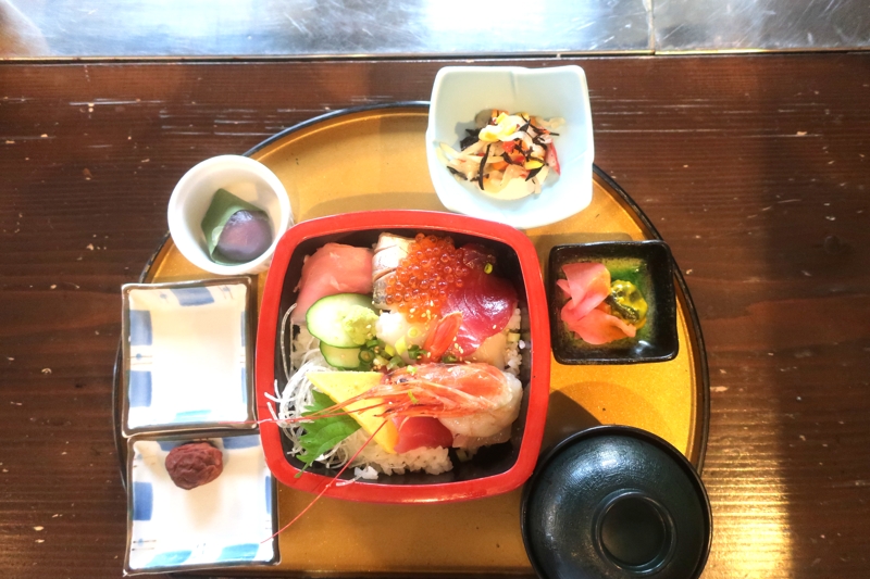 勝浦で食べた海鮮丼。写真左下梅干しは特別注文。