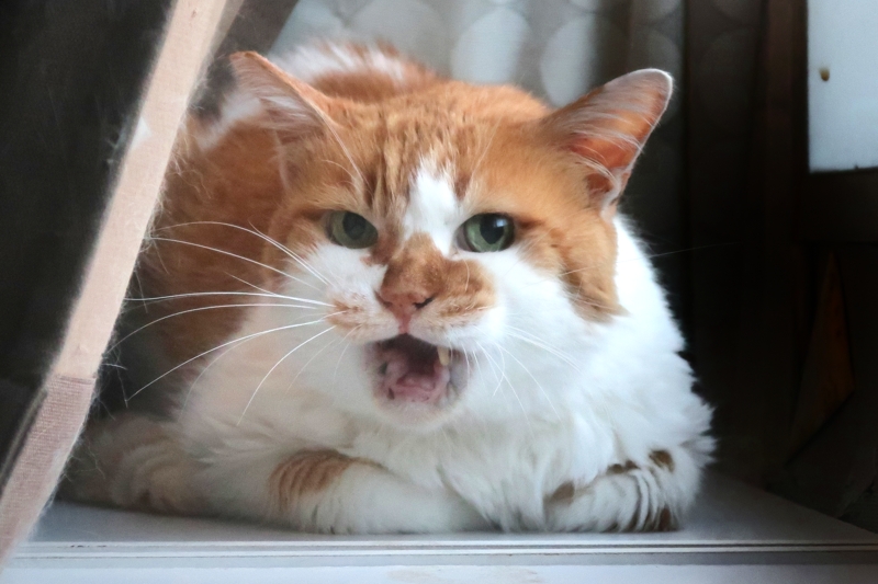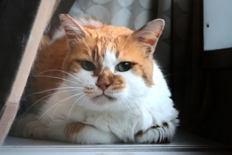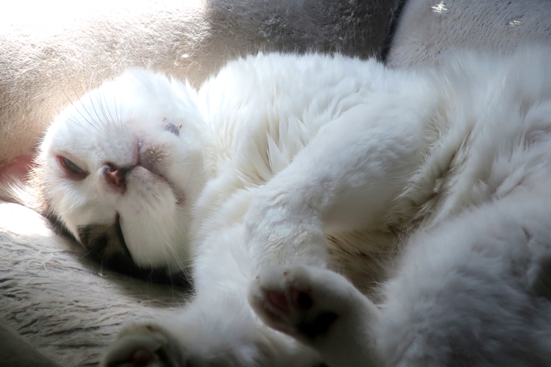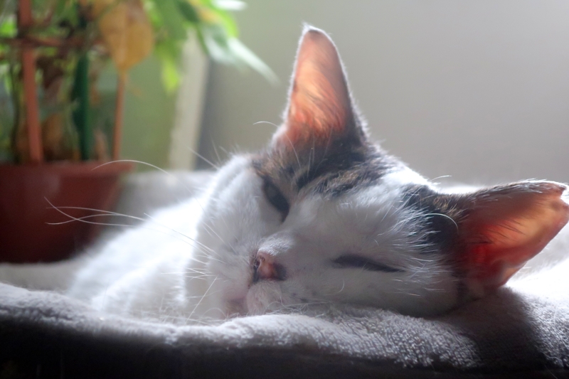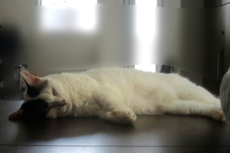 いくら冷房が効いていても、真夏の直射日光はきつい。写真右、いつも日向ぼっこをしている場所から、ひんやりした場所に移動したハナちゃん。