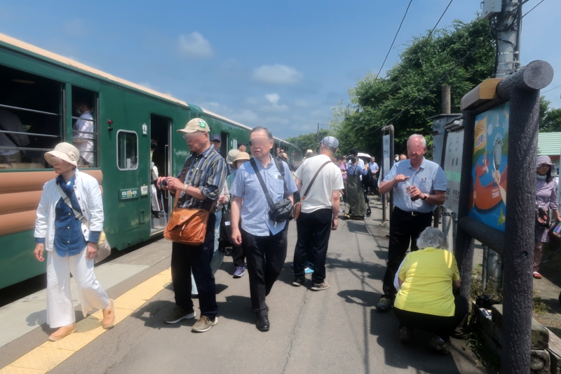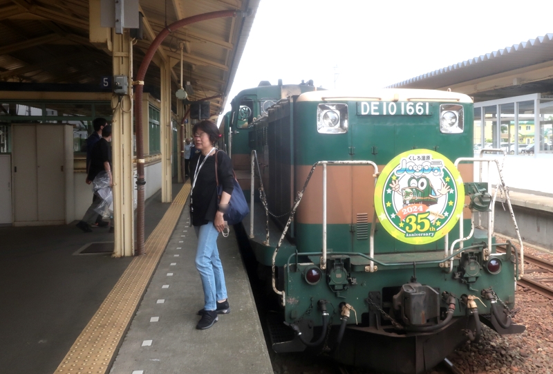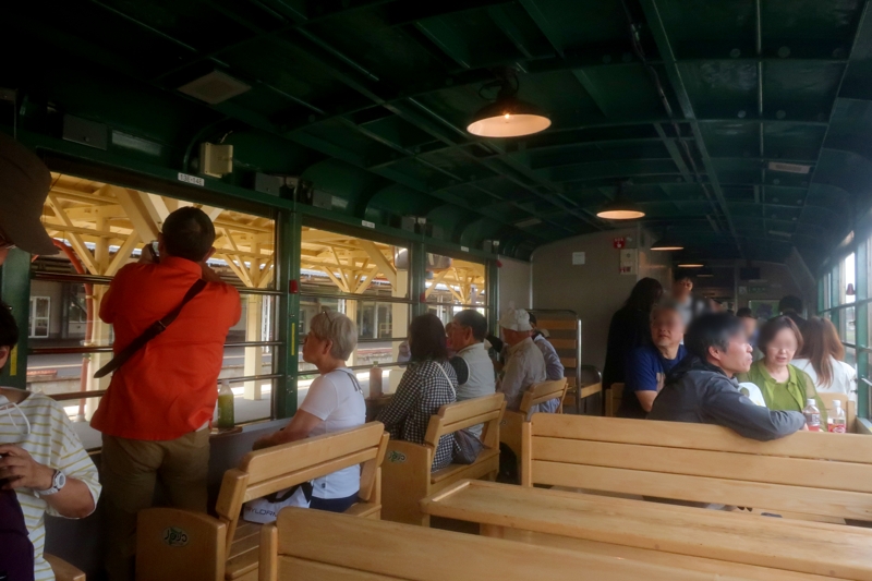 写真左はノロッコ号、右は室内。同じ席に大阪から来た60代の「大阪のおばちゃん」がどっかと座り、大変な盛り上がりで、お互いに飴なんかを交換しました。