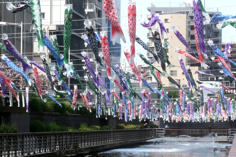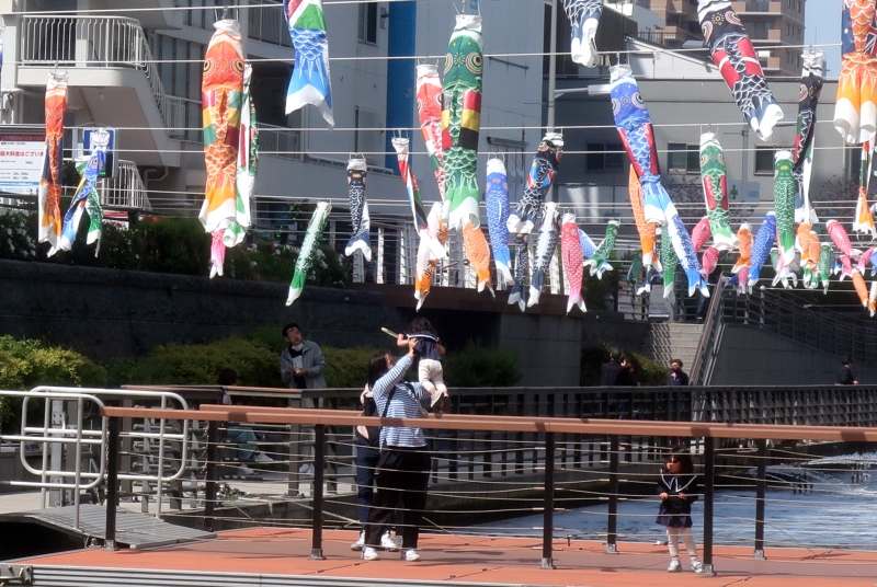 スカイツリー付近の川で見かけた鯉のぼり。黒、赤、青、緑、紫、橙。カラフルですね。写真右、お母さんに抱きかかえられて。20年後、この子はどうなっているかな。