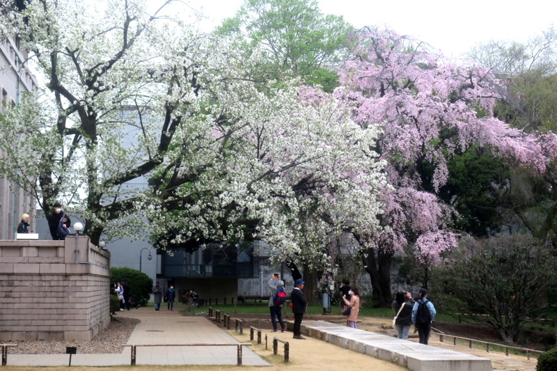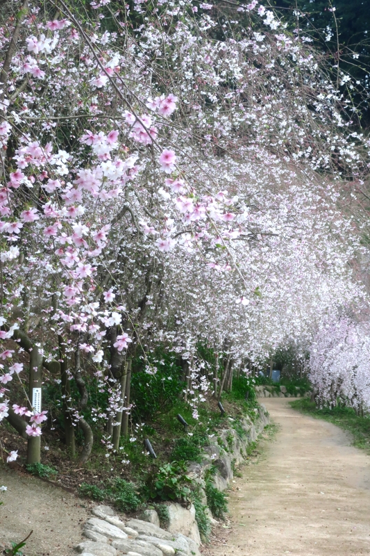 九博の庭園。枝垂れ桜が植えられている山道が続き、見事な庭園です。
