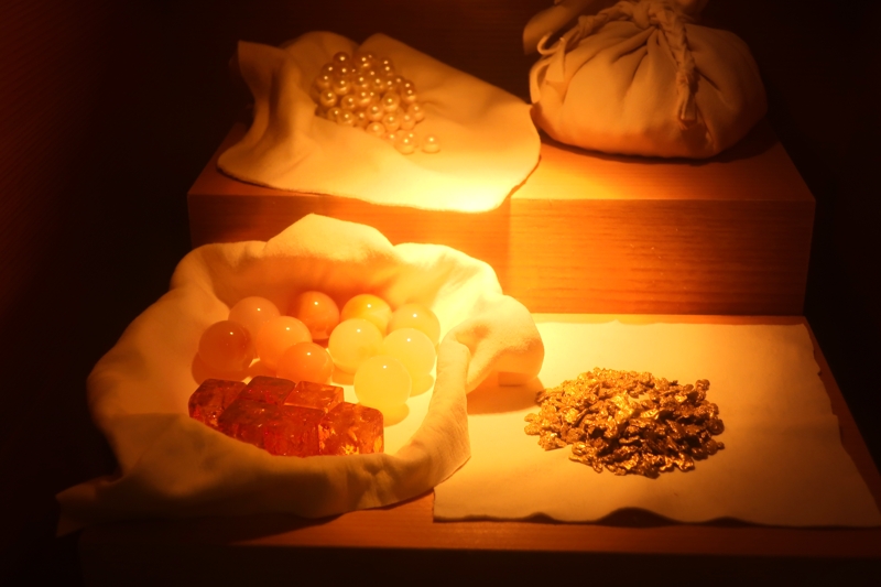 写真右。当時の宝石。琥珀、めのう、真珠、金箔、玉。